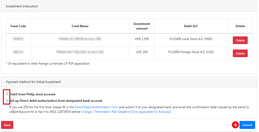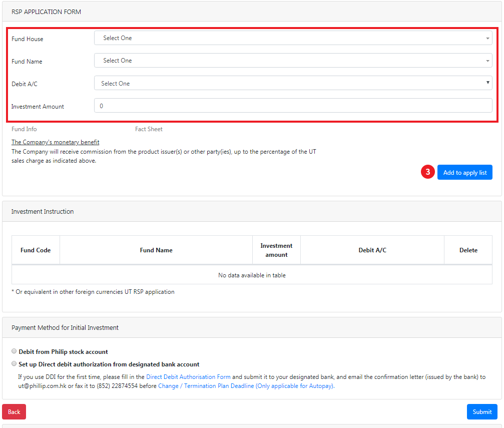 Step 3: Choose “Fund House”, “Fund Name”, “Debit A/C” and “Investment Amount” > Click “Add to apply list” to add the instruction to “Investment Instruction” column
