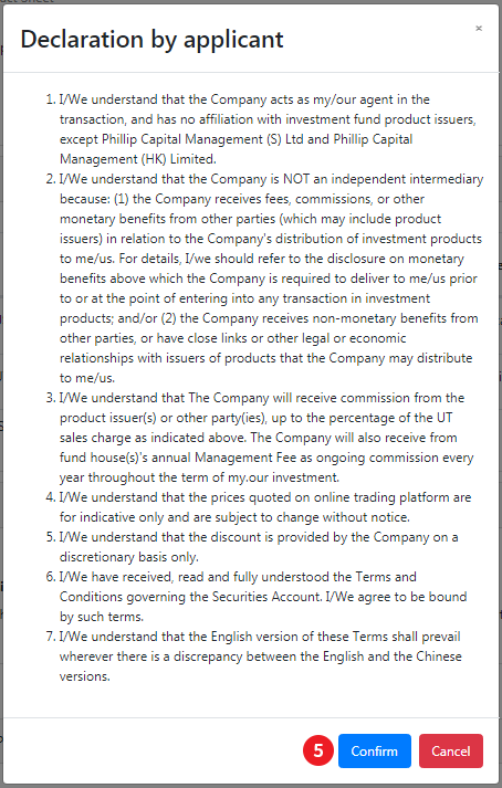 6. Due to the Personal Data (Privacy) Ordinance, Phillip Securities (Hong Kong) Limited (the Company) is unable to check the status of Direct Debit Instruction (DDI) approval from your bank. Please submit the Direct Debit Authorization application form (original) to the payment bank. Once you receive the confirmation notice from the bank, please contact the Company to initiate the DDI service for the following. If the DDI is terminated, the Company must receive a written notice of at least five working days before the transfer date.