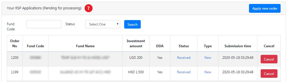 Step 7: The application will be processed after 2:00 p.m. every workday, you may check or cancel the application before 2:00p.m. on “Your RSP Applications (Pending for processing)” column.