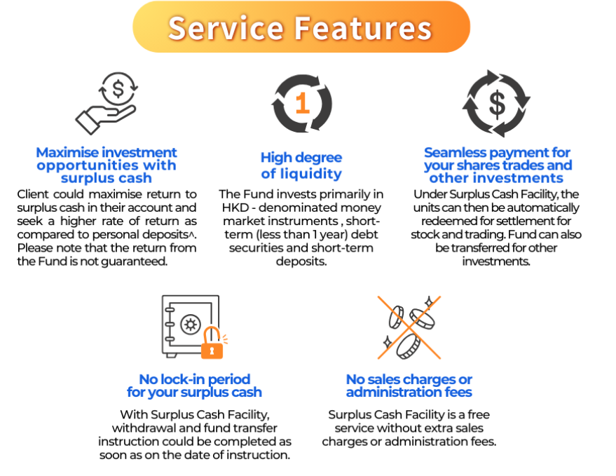 Income of the Hong Kong Dollar Money Market Fund is not guaranteed, “Surplus Cash Facility” is not equivalent to bank deposits. Investor should read the fund fact sheet and related documents in order to understand the underlying risk.