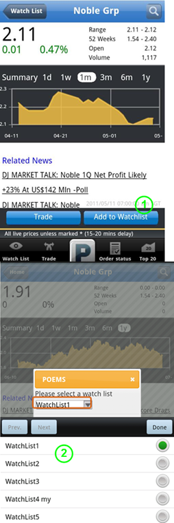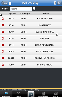 | 5.Display Area | - Swiping left/right will switch between the different watchlists. - Tap on the company name to view Stock Details page of the selected counter. - Tap on the prices or figures redirect user to the Trade Submission page with the stock information already filed in. |