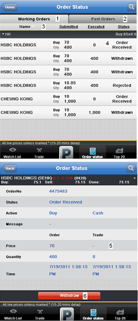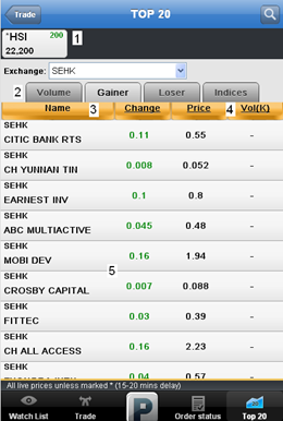 | 6.Display Area | - Swiping left/right will switch between the different lists of Top 20s. - Tap on the company name to view Stock Details page of the selected counter. - Tap on the prices or figures will redirect user to the Trade Submission page with the stock information already filled in. |