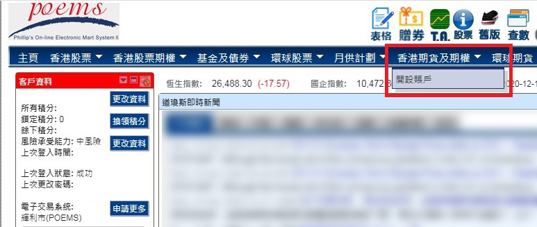 1.使用電腦瀏覽器登入網上POEMS平台後,按「香港期貨及期權」,然後按「開設帳戶」