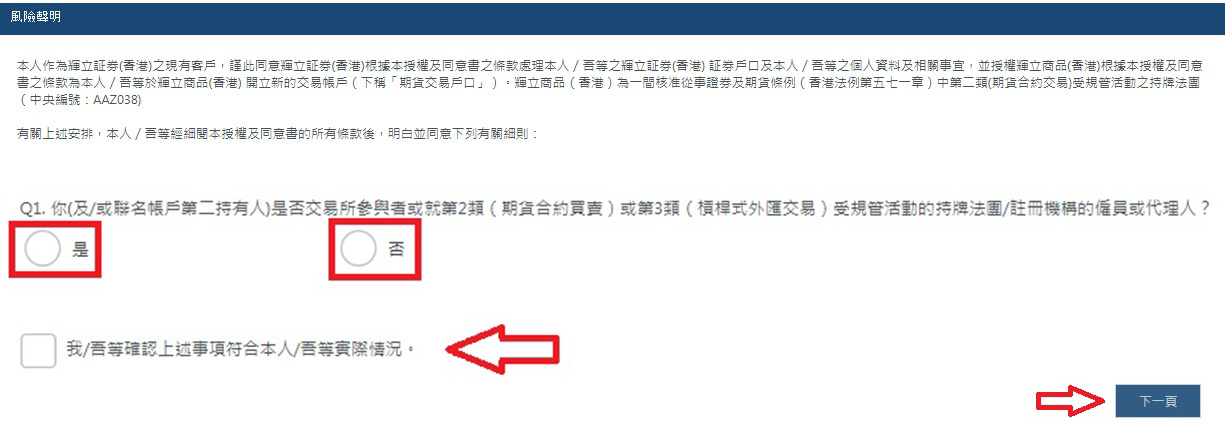 2.閱讀風險聲明,回答相關問題,並確認無誤,然後按「下一頁」