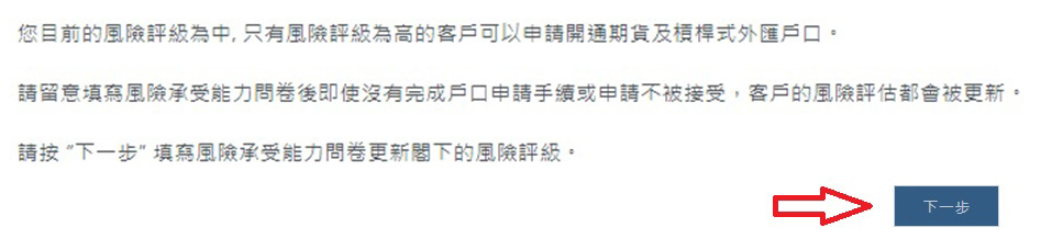 5.閣下的風險評級必須為「高」才可開立期貨及槓桿式外匯帳戶,如閣下的帳戶目前風險評級為「中/低」,則需按「下一步」填寫風險承受能力問卷更新風險評級。