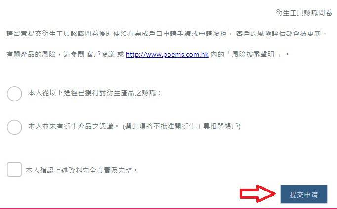 7.填寫、確認及提交衍生工具認識問卷。請注意,如閣下並未有衍生工具之認識,將不批准開立衍生工具相關帳戶。