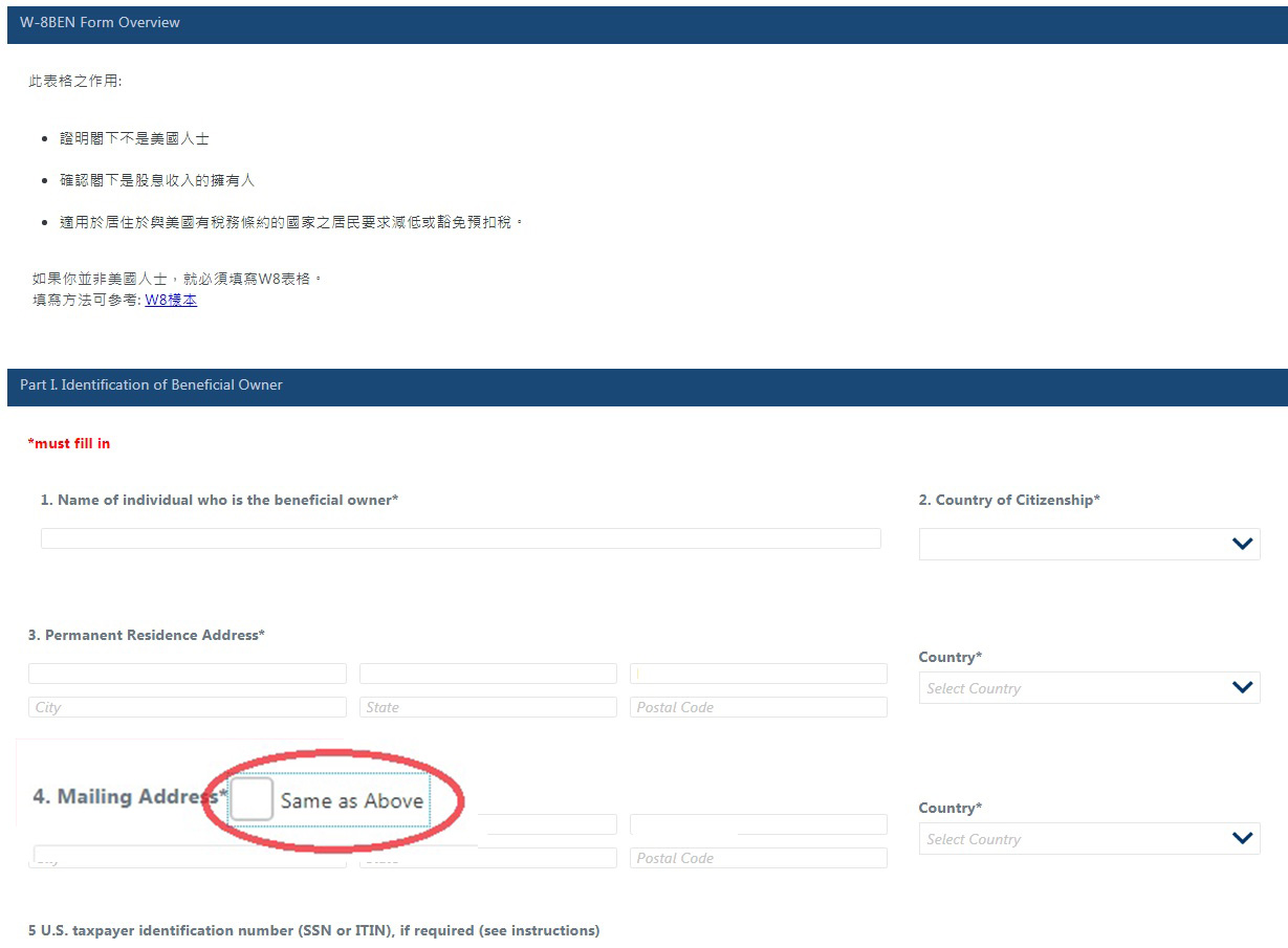 8.填寫W8表格,如郵寄地址與住址相同,只需按"Same as Above"便可。