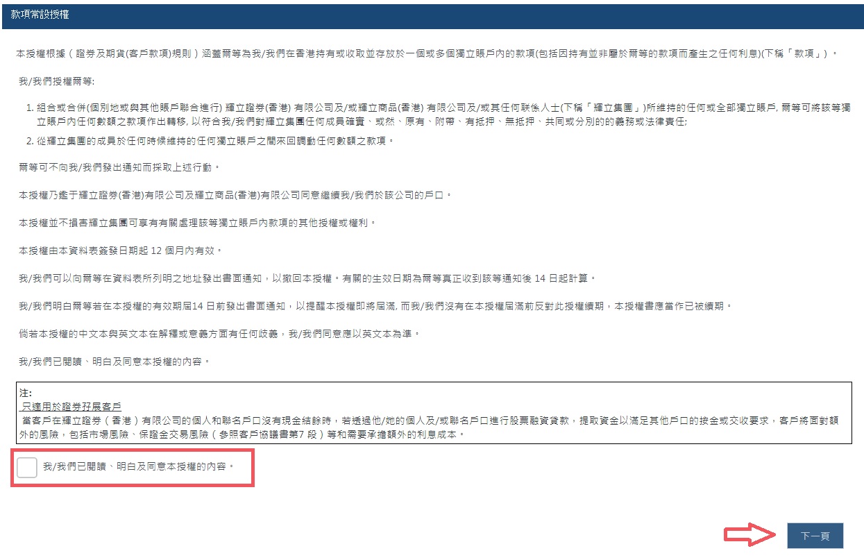 9.如閱讀、明白及同意款項常設授權內容,請按確認方格然後按「 下一頁」。