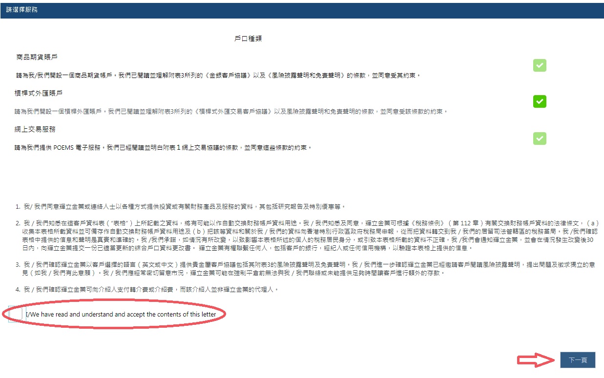 12.最後確認閣下想開設的戶口種類/服務、並閱讀並同意頁面內容後,按 "I/We have read and understand and accept the content of this letter",然後按「下一頁」。