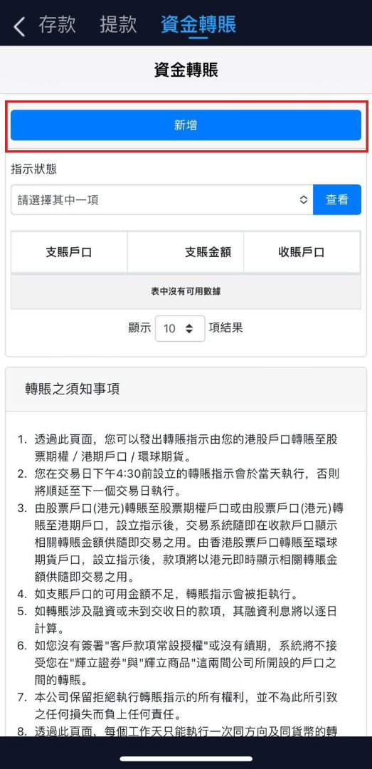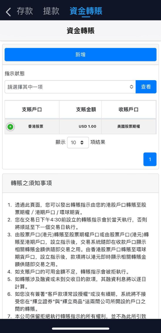 3. 頁面上方顯示現金餘額,下方顯示持倉。