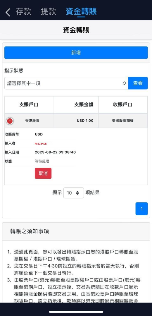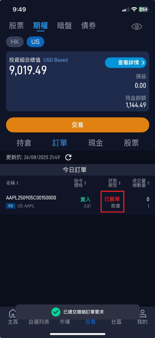 12. 如成功撤單,交易狀態會顯示:已撤單; 如訂單已成交,交易狀態會顯示: 已成交。