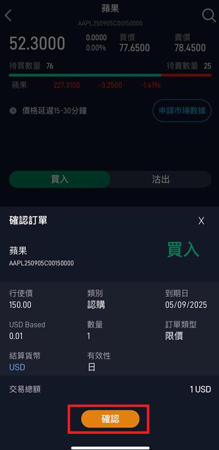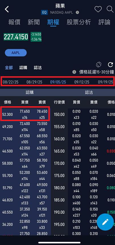6. 進入相關股票後 → 點擊上方 期權,選擇到期日,於期權鏈選取合約(例:AAPL 150.00 2025-09-05 認購)。