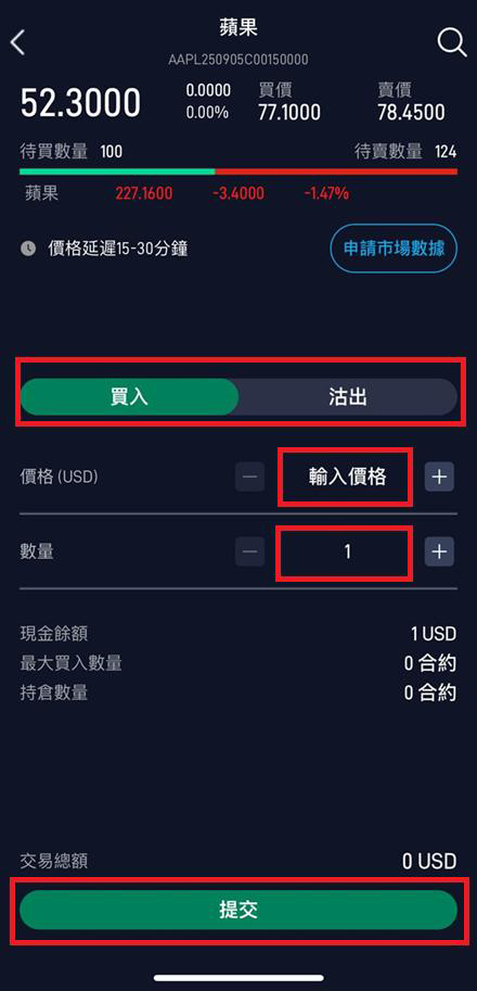 8. 選擇 買入/沽出,輸入價格與數量,點擊 提交。