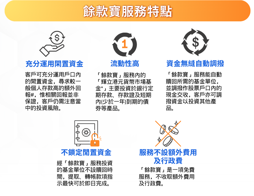 「餘款寶」是一項現金管家服務,讓客戶能更靈活使用戶口內的閒置資金。港股戶口內的港元閒置資金將自動轉移至「輝立港元貨幣市場基金*」作尋求額外收入#。