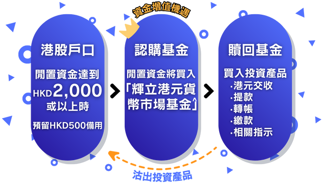 有,香港股票戶口內的閒置資金HKD2,000或以上,便會啟動自動調撥機制,在預留HKD500於戶口內作備用現金後,餘下的閒置資金將買入「輝立港元貨幣市場基金」。